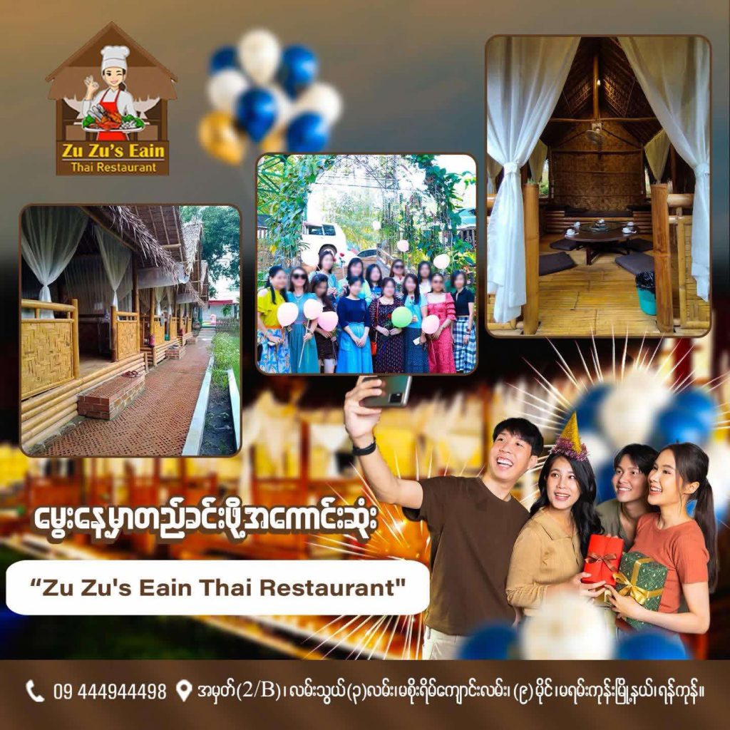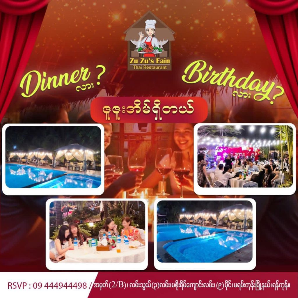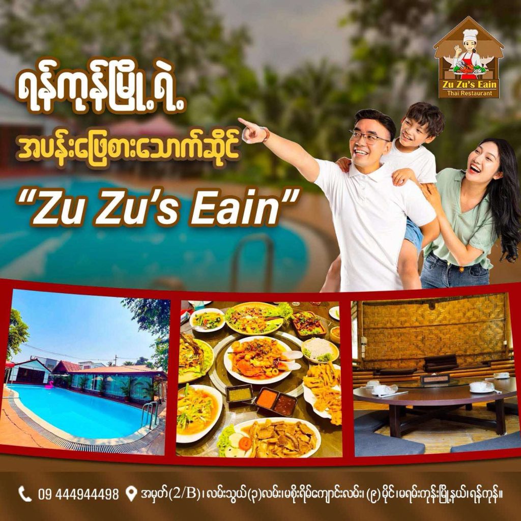 Zu Zu’s Eain Thai Restaurant ရဲ့ ဆောင်ပုဒ်လေးဖြစ်သည့် ” Taste, Relax, and Enjoy With Your Family “ဆိုသည့်အတိုင်း မြို့ပြနှင့်အဝေးကို သီးသန့်သွားရောက်စရာမလိုပဲ ရန်ကုန်မြို့တွင်းထဲတွင် ချစ်ရတဲ့ မိသားစု မိတ်ဆွေသူငယ်ချင်းများနှင့်အတူ သန့်ရှင်းလတ်ဆတ်ပြီး အရသာရှိသည့် ထိုင်းအရသာဟင်းပွဲကြီးများနှင့် ပင်လယ်စာဟင်းပွဲကြီးများကို သုံးဆောင်ရင်း ရေကူးအနားယူ အပန်းဖြေနိုင်ရန်အတွက် ဖွင့်လှစ်ခဲ့ခြင်းဖြစ်ပါသည်။
